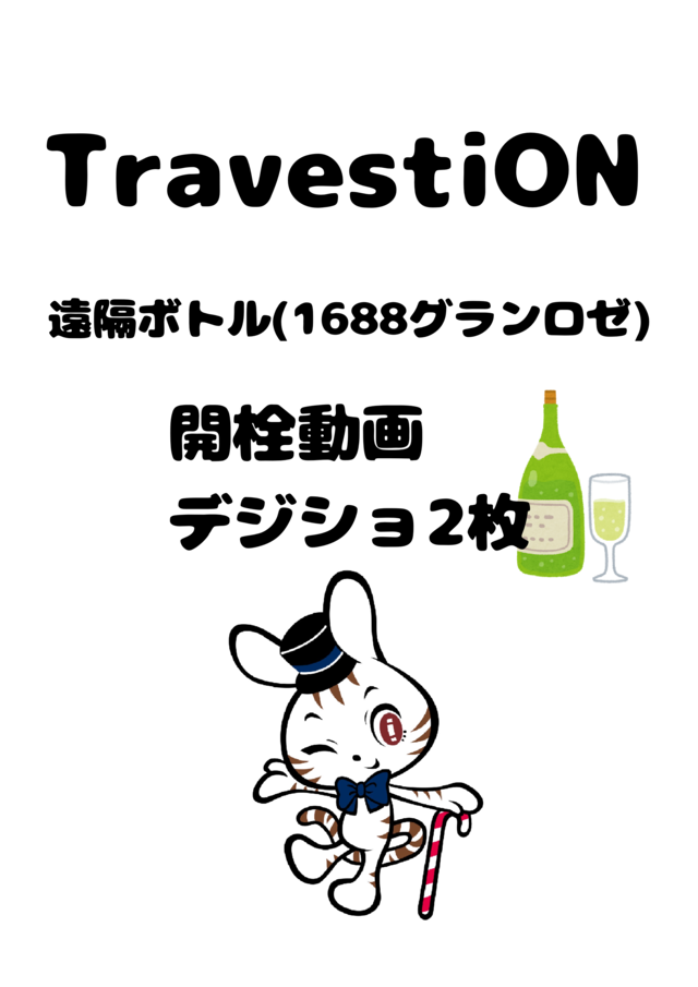 ■ 遠隔シャンパン(開栓動画) 好きなキャストにシャンパンをプレゼントして、 キャストが開栓動画を撮影してお届けします! ■ ご購入の流れ ① BOOTHで遠隔ボトルをご購入 ② ご購入後に注文番号をXのDMでキャストへご連絡下さい ③ キャストより開栓動画をXのDMにてお届けします ※店舗にお越しいただく必要はありません ※遠方からでも推しのキャストを応援できます ■ キャストと繋がりがない方 【ご連絡先】 ・TravesitON公式X:https://x.com/CafeTravestiONより 各キャストのXアカウントへ直接DM 【お知らせいただく内容】 以下の項目をXよりご連絡下さい ・購入者様の通称名 ・特典動画が受取れるアカウント(Xアカウント等) ※推しのキャストよりXのDMにて開栓動画をお届けいたします ■ 重要事項 ※ご注文後のキャンセル・返金は一切お受けできません ※この商品は店舗受取・配送はございません ※特典動画、画像のお届けのみとなります ※特典の都合上、当日営業時間内にお支払いをお願いいたします。 ■ ご不明点・お問合せ https://x.com/CafeTravestiON 遠方からでも推しのキャストを応援しよう!